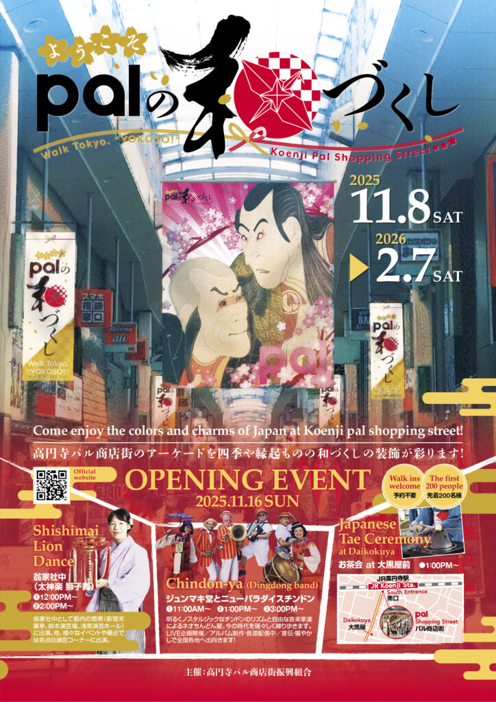 高円寺パル商店街振興組合は、2025年11月8日(土)から2026年2月7日(土)まで、アーケード装飾企画「ようこそpalの和づくし」を開催します。