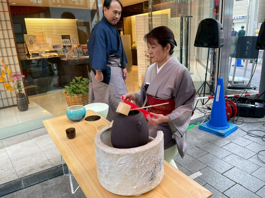 どなたでも参加できるよう路上に臨時の茶席を設け、お点前を見ながらより多くの方が楽しめる裏千家流・立礼(りゅうれい)式での開催。